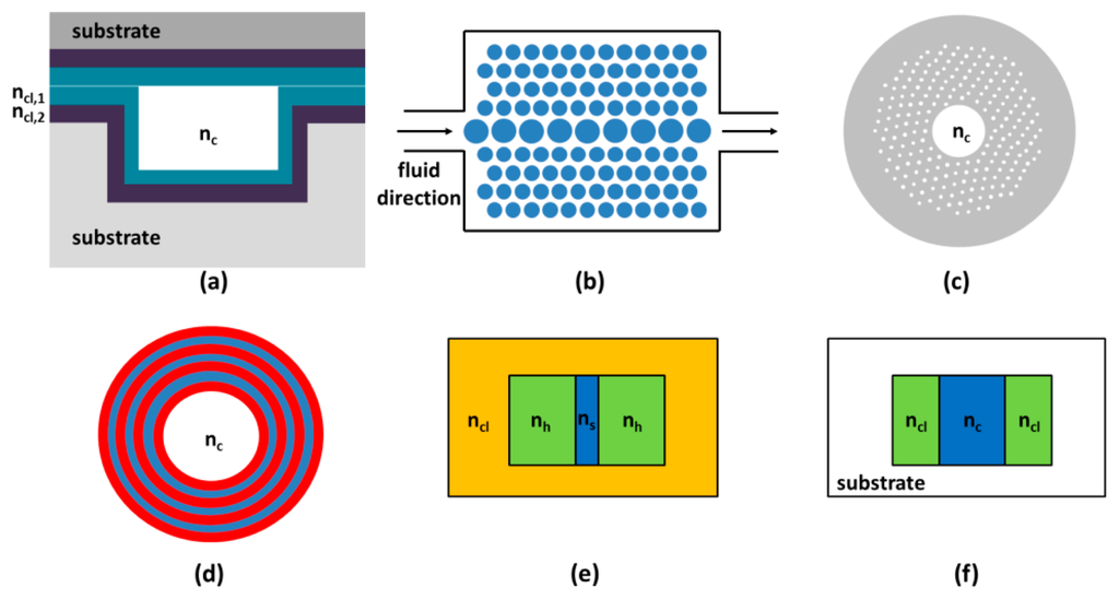In hollow core fibers based on Bragg guidance mechanism (HC-BFs), the guiding structure is composed by dielectric cladding layers that coat the internal walls of a hollow core as shown in Figure 1d. An interesting structure is obtained by microstructuring the cladding with multiple silica rings joint by nanoscale silica supports. These waveguide, called all-silica hollow-core microstructured Bragg fibers, have been investigated and proposed for biosensing application by Passaro et al. [18].