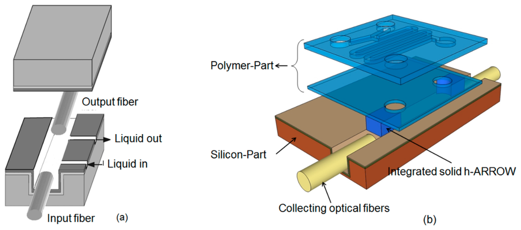 Recently, in the work of Testa et al., an optofluidic platform based on hybrid liquid core ARROW waveguides for fluorescence spectroscopy of liquids has been presented [45]. The chip was assembled in a modular structure, with the upper polymeric part including solely microfluidic functionalities (Figure 2b). The optical part has been realized developing a polymer-silicon hybrid solution in order to form a fully integrated platform connected with the upwards microfluidic system. Solid core hybrid ARROWs (solid h-ARROWs) have been suitably integrated in the polymeric part in a self-aligned configuration with the liquid core waveguides containing the sample to be tested. This hybrid solution allows us to seal the liquid h-ARROW and to couple light from/toward the exciting/collecting off-chip optical fibers. The presented approach is unique among other as hybrid integration was implemented for the fabrication of the both photonic and fluidic elements on the same chip. A first prototype has been fabricated with integrated passive micromixer as microfluidic element. The sensing performance of the device was tested by performing fluorescence measurements at different concentration, controlled by means of the integrated micromixer; an LOD of 2.5 nM was demonstrated. The proposed modular approach represents the major step toward a truly hybrid optofluidic chip and offers prospects of high functional flexibility inherent to optofluidics, as the microfluidic part can be easily replaced and adapted to different detection schemes.