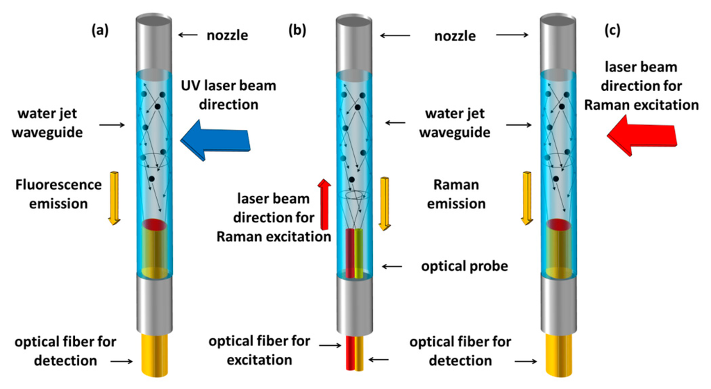 As other liquid core waveguides, jet waveguides exploit TIR for light propagation. However, a very high refractive index contrast between the core (liquid) and cladding (air) leads to a very high numerical aperture (NA = 0.88 for water core). Hence, in principle, liquid jets exhibit significant collection efficiency. The advantages of these simple but effective optical waveguides have been neglected until recent times [37] when the group led by Bernini proposed an experimental configuration able to overcome the typical complications arising in conventional approaches. Liquid core waveguide with solid or liquid cladding are usually surrounded by solid structures that are potential sources of scattering (by surface roughness) or autofluorescence. Beside the advantage related to its collection efficiency, in a jet waveguide, the absence of solid walls to contain the liquid waveguide and the smoothness of the liquid/air surface enable very low background signal arising from scattering.