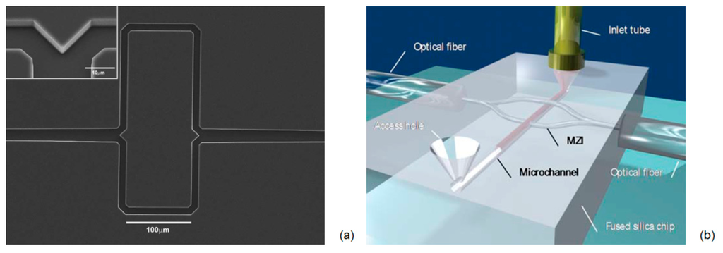 - Bernini, R.; Testa, G.; Zeni, L.; Sarro, P.M. Integrated optofluidic Mach-Zehnder interferometer based on liquid core waveguides. Appl. Phys. Lett. 2008, 93, 011106. [Google Scholar]