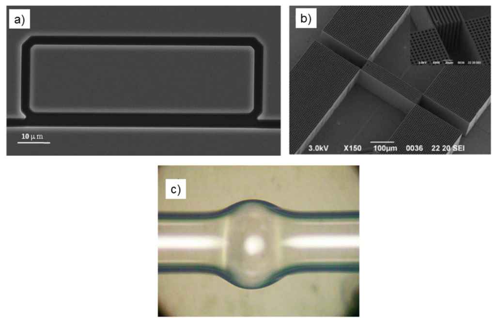 Optofluidic resonators have been also fabricated using photonic crystals. These structures are a powerful building block for optofluidics as the cavity holes, designed to provide strong light confinement, can also be exploited for fluid flowing [71]. The group of Barillaro et al., have recently demonstrated that a high-aspect ratio vertical silicon/air walls 1D PhCs is a very powerful tool for optofluidic applications [72]. Basically, by exploiting the air gaps as microfluidic cavity, they developed a first generation prototype of an integrated refractive index optofluidic sensor by using a 1D PhC sealed with a borosilicate glass cover with integrated a fluid inlet for liquid injection into the air-gaps. A bulk sensitivity of 1049 nm/RIU at λ = 1.55 μm has been demonstrated, which is well compared to sensitivities of state-of-the-art integrated refractive index sensors. As it has been envisioned by the group, high aspect ratio 1D PhCs are very promising key structures for the realization of more sophisticated optofluidic microsystem [73]. A second generation PhCs optofluidic microsystem (PhC-OFM) has been realized by the group, with integrated fluidic and optical sections on the same chip [74] (Figure 5c). By exploiting electrochemical machining (ECM) technology, vertical silicon walls with height comparable with standard optical fiber diameter were fabricated. Moreover grooves etched in silicon were suitable integrated, thus allowing a simple alignment procedure between the PhC structure and the readout optical fibres. Fluidic section for handling injection of fluids in the 1D PhC air gaps comprise reservoirs/microfluidic channels integrated in silicon. A best bulk sensitivity value of 670 nm/RIU and a best limit of detection of the order of 10−3 RIU were demonstrated. A very promising proof of concept about the biosensing potential of PhC-OFM has been also demonstrated by carrying out an immunoassay for C-reactive protein, paving the way to the opportunity of realizing a fully integrated PhC optofluidic biosensors.