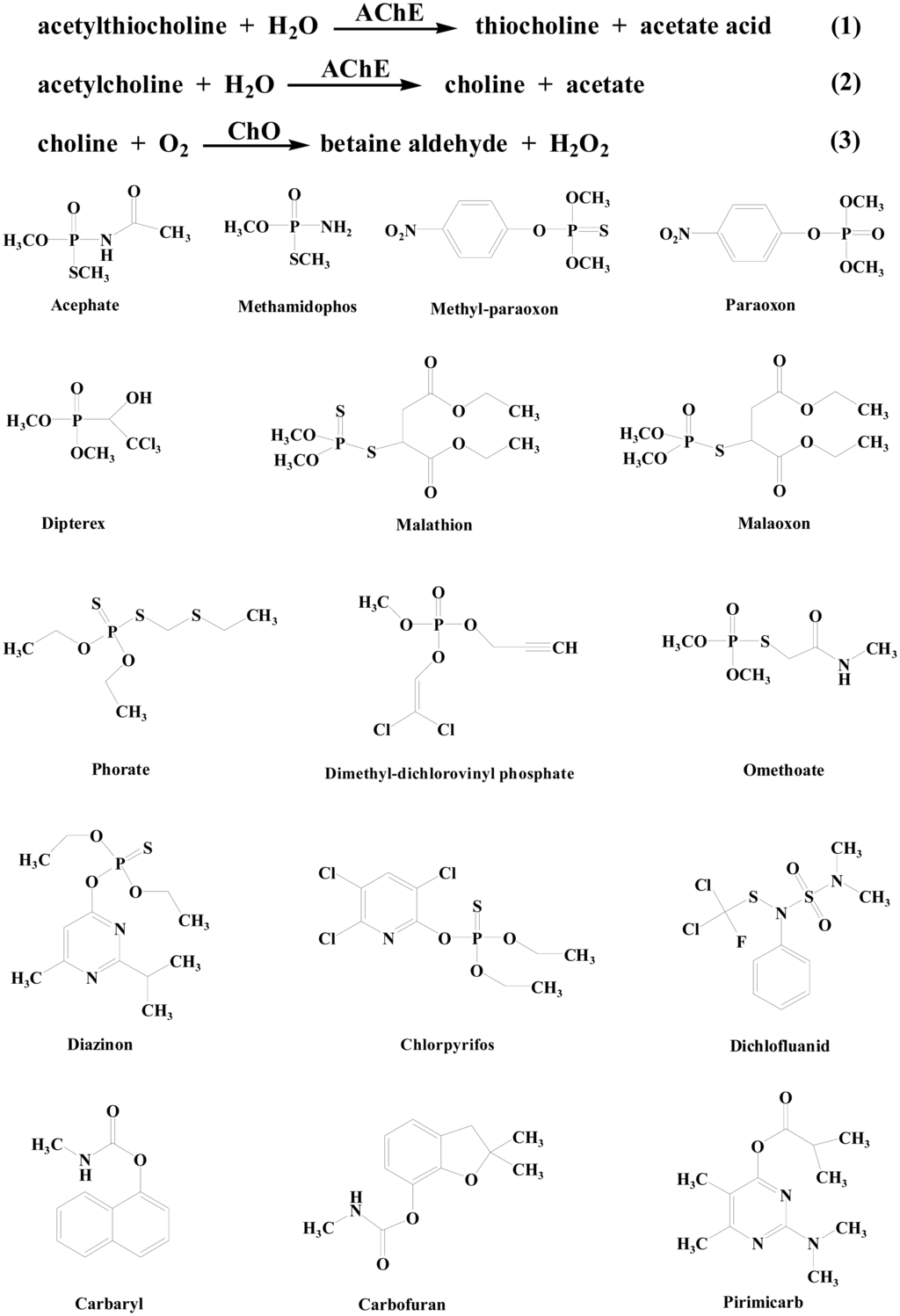 Acetylcholinesterase (AChE) catalyzes the hydrolysis of the neurotransmitter acetylcholine (ACh) to inactive choline. Inhibition of AChE will lead to the accumulation of acetylcholine in the synaptic cleft, resulting in impeded neurotransmission. AChE has regained great attention recently due to its association with Alzheimer's disease (AD) and other neurodegenerative diseases characterized by low ACh levels owing to catabolism by AChE [,]. Moreover, AChE is the primary target of inhibition by organophosphorus compounds such as nerve agents and pesticides (Figure 1); thus, public concern about the development of detection devices for effectively monitoring pesticides has also grown steadily [–].