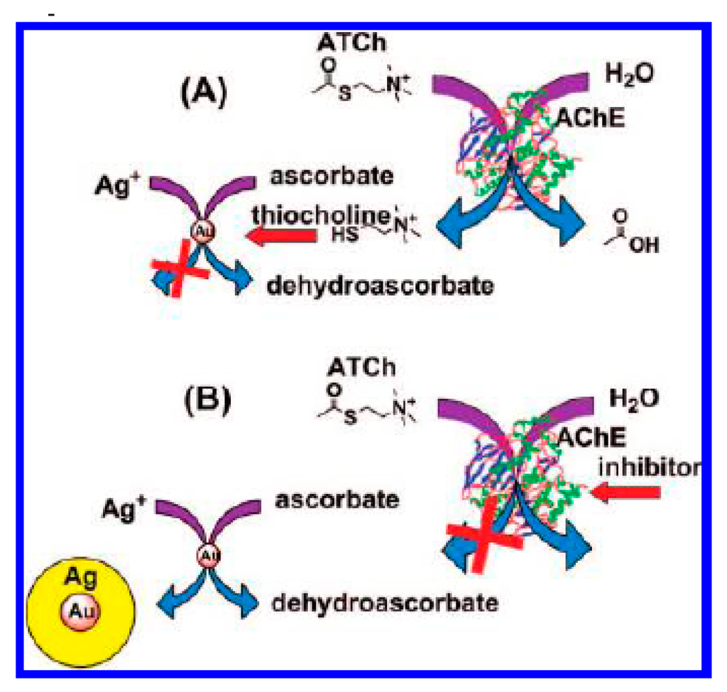 Because of the high extinction coefficients and the unique size-dependent optical properties of gold nanoparticles (AuNPs), AuNPs-based colorimetric assays have recently become useful for many types of analytes without the need for advanced instruments, including screening the enzyme activity and measuring the concentrations of nucleic acid, proteins, metal ions and other small molecules [–]. In this process, molecular events can be transformed into color changes. Usually, the color changes are highly sensitive to the size, shape, capping agents, and medium refractive index, as well as the aggregation states of AuNPs, which can be confirmed by the significant absorption band shift in the visible region of the electromagnetic spectrum. Based on the unique physical properties of AuNPs, Pavlov et al., presented the first colorimetric detection of AChE inhibitors based on the color change of AuNPs []. In the work, AChE mediated hydrolysis of acetylthiocholine to yield a reducing reagent thiocholine that modulated the growth of AuNPs seeds in the presence of AuCl4−. The catalytic growth of AuNPs was prevented by inhibition of AChE activity using 1,5-bis(4-allyldimethyl-ammoniumphenyl)-pentane-3-one dibromide or paraoxon, thus enabling a colorimetric assay for AChE inhibitors. However, this method is less sensitive because the enzymatic generation of AuNPs would consume thiocholine produced in the course of enzymatic reactions. Thus, the authors developed another method for the detection of AChE inhibitors based on the modulation of AuNPs growth by the enzymatically generated thiocholine []. As shown in Figure 2, the produced thiocholine hindered the deposition of Ag reduced by ascorbic acid from AgNO3 by binding to the surface of the Au seeds. As a result, the formation of Ag-coated AuNPs is blocked (route A). In the presence of AChE inhibitors, hydrolysis of acetylthiocholine by AChE was prevented, which allowed for the deposition of Ag on AuNPs surface (route B).