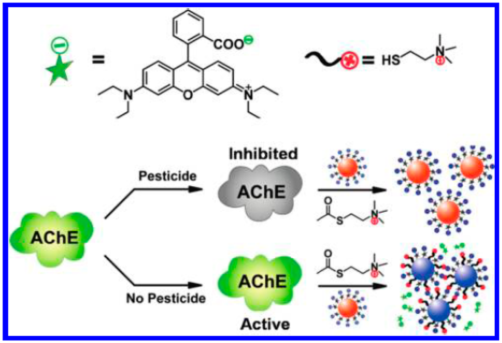 The modulation of aggregation states of AuNPs has also been broadly used as a colorimetric assay for various analytes. With the continual aggregation of AuNPs, the color of the dispersion gradually changes from an initial red to purple, then blue and, finally, yellow. The color change of AuNPs suspension can be confirmed by the significant absorption band shift in the visible region of the electromagnetic spectrum. For this view, Wang et al. demonstrated that the positively charged thiocholine can substitute the citrate on the surface of AuNPs; as a result, the cross-linking/aggregation of interparticles occurs because of the electrostatic interaction between thiocholine and citrate on gold surface, leading to the red-shift of the plasmon absorption of AuNPs suspension []. The degree of AuNPs aggregation is strictly dependent on the concentration of the produced thiocholine; thus, AChE activity could be monitored by the AuNPs-based colorimetric assay. With the method, AChE at the concentration as low as 0.6 mU/mL and tacrine (a well-known inhibitor for AChE) below 4 nM can be readily assayed. With the same principle, Sun et al., reported the detection of organophosphate (OP) nerve agents and pesticide using lipoic acid (LA)-capped AuNPs with a pM detection limit []. Furthermore, Liu et al., reported the assays of AChE in the cerebrospinal fluid of transgenic mice suffering from Alzheimer's disease and four pesticides (carbaryl, diazinon, malathion and phorate) using rhodamine B (RB)-functionalized AuNPs (RB-AuNPs) as the dual (colorimetric and fluorometric) readouts [–]. Specifically, electrostatic absorption of RB onto the surface of AuNPs leads to the quenching of RB's fluorescence (Figure 3). Thiocholine produced from acetylthiocholine by AChE substitutes RB on the surface of AuNPs, resulting in the color change of the solution from red to purple, simultaneously accompanied by the recovery of fluorescence of RB. The detection limit for AChE reaches 0.1 mU/mL and the lowest detectable concentrations for carbaryl, diazinon, malathion, and phorate are 0.1, 0.1, 0.3 and 1 μg/L, respectively.