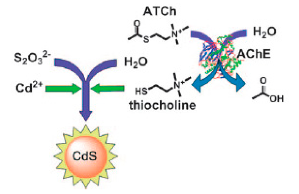 Comparing the chromatography evaluations and electrochemical analysis methods that need either time-consuming operation or complicated labeling and modification procedures, fluorimetric methodologies stand out as rapid, sensitive, and efficient especially in combination with the nanotechnologies and fluorescent nanomaterials. Semiconductor quantum dots (QDs) are the commonly known nanoparticles used in fluorescent sensing. The most important advantages of QDs over organic fluorophores are higher brightness, reduced photobleaching and longer lifetimes. Recently, several groups have reported the QDs-based fluorescence assays for detection of AChE activity and organophosphorus pesticides [,–]. Typically, Pavlov's group demonstrated that thiocholine released from the AChE-catalyzed hydrolysis of acetylthiocholine (ATCh) are able to catalyze the production of fluorescent CdS QDs in the presence of thiosulfate and Cd2+ (Figure 4) [] and can mediate stabilization of in situ produced CdS quantum dots []. As a result, AChE activity and its inhibitors can be determined by the fluorescence intensity of the resulting CdS QDs.