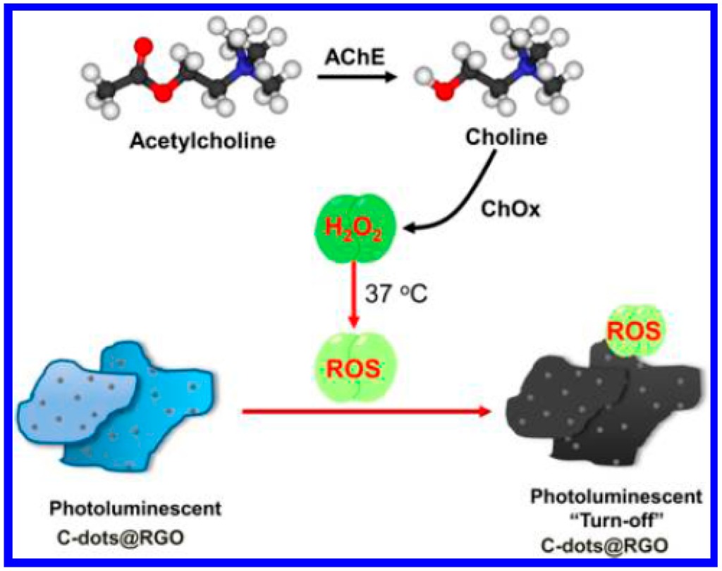 Reduced graphene oxide (RGO) has become a very popular sensing material for the detection of DNA, proteins, and small molecules because of its large planar surface and high photoluminescence quenching efficiency to fluorophores (e.g., organic dyes, quantum dots) []. However, as-prepared RGO is usually hydrophobic and nonphotoluminescent, thus limiting its direct use for biological application []. Recently, Chang's group reported a strategy for the synthesis of hydrophilic, photoluminescent (PL) carbon dots on RGO (C-dots@RGO) from graphene oxide (GO) through a hydrothermal reduction route using catechin as a reductant [,]. Furthermore, they found that the AChE/ChOx-mediated production of H2O2 caused the photoluminescent quenching of the C-dots@RGO via an etching process (Figure 5) []. The photoluminescent intensity of the C-dots@RGO is inversely proportional to the acetylcholine concentration in the range of 0.05−10 nM, with a detection limit of 30 pM. By this method, the concentrations of acetylcholine in plasma and blood samples were determined to be 2.6 nM and 6.8 nM, respectively.