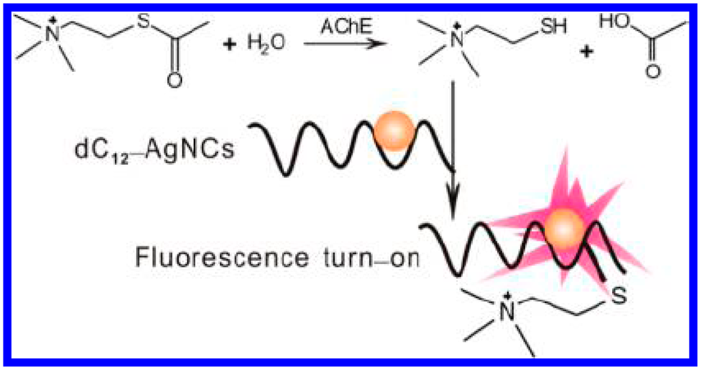 The emerging technology of fluorescent few-atom metal (e.g., Au or Ag) nanoclusters (NCs) offers an attractive compromise between the photostability and brightness of quantum dots and the compact versatility of dye fluorophores []. This technology has recently been used in a wide range of chemical or biological detection and cellular imaging applications. For this consideration, Li et al. developed a fluorometric sensor for the detection of AChE activity and its inhibitors []. The method was based on the thiocholine-induced fluorescence quenching of DNA-templated copper/silver nanoclusters (DNA-Cu/AgNCs). The AChE activity could be detected as low as 0.05 mU/mL and with a linear range from 0.05 to 2.0 mU/mL. Inversely, Zhang et al., found that the reaction of thiocholine to 12 polycytosine-templated silver nanoclusters (dC12−AgNCs) through the formation of Ag−S bonds lead to the increase of fluorescence of dC12−AgNCs (Figure 6) []. The hydrolysis of ATCh chloride was retarded in the presence of the corresponding inhibitor. Thus, AChE activity and its inhibitors could be determined with dC12−AgNCs as the fluorescence probes. This method allowed for the assay of AChE as low as 0.05 mU/mL. Moreover, based on the interaction of thiocholine and Ag(I), Liao et al. reported a “turn-on” fluorescent method for probing of AChE activity and sensing of AChE inhibitors. Specifically, a polyanion (poly(vinyl sulfonate)–PVS) could induce the aggregation and fluorescence quenching of a perylene probe (probe 1). The produced thiocholine interacted with Ag(I) to form a positively charged metal coordination polymer. As a result, the polycation interacted with the polyanion and caused the release of the free probe 1 monomer molecules, and a fluorescence turn on signal was detected [].