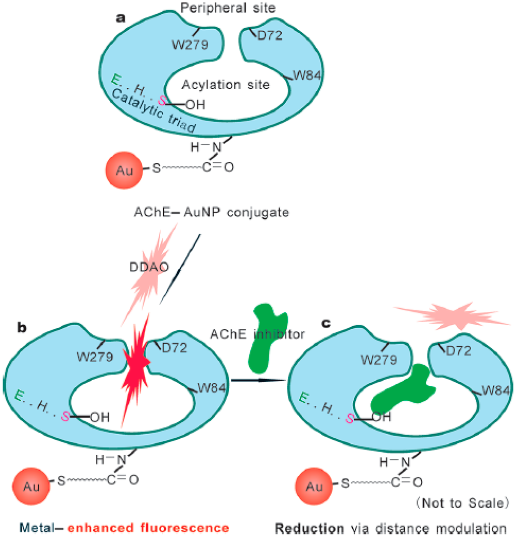 Recently, there has been increasing attention paid to the use of metal NPs-based metal-enhanced fluorescence (MEF) for immunoassays, protein translation and DNA detection [–]. Enhancement is attributed primarily to the increased electric field close to the metal NPs induced by incident light. One of factors affecting the enhancement magnitude is the distance between fluorophores and metal nanostructures. Interestingly, Zhang et al. found that AChE could modulate the distance between AuNPs and fluorophore 7-hydroxy-9H-(1,3-dichloro-9,9-dimethylacridin-2-one) (DDAO) (Figure 7) []. Binding of DDAO to AChE immobilized onto AuNPs lead to the enhancement of DDAO's fluorescence due to MEF (Figure 7a). Because AChE inhibitors competed with DDAO to bind the peripheral anionic site and penetrate into the active gorge site of AChE, inhibition of AChE activity by AChE inhibitors such as paraoxon and tacrine prevented the interaction of AChE and DDAO, thus resulting in the distance variation between AuNPs and DDAO and reducing the fluorescence signal (Figure 7b). The results demonstrated that the biosensor shows low detection limits for paraoxon (0.4 μM) and tacrine (10 nM).