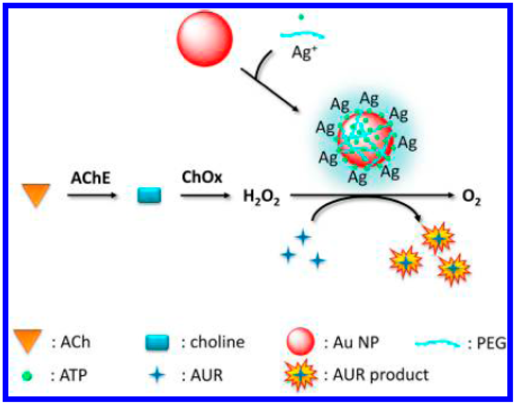 Moreover, nanoparticles (NPs) including Fe3O4, sheet-like FeS, spherical CeO2, single-walled carbon nanotubes, graphene oxide, AgM (M = Au, Pd, Pt) and metallic nanocomposites show peroxidase- or oxidase-like activities [,,,]. Chang's group suggested that Au/Ag bimetallic nanoparticles promoted the H2O2-mediated oxidation of Amplex UltraRed (AUR) and thus reported the fluorescent detection of acetylcholine (Figure 8) []. In this process, AChE catalyzes the hydrolysis of acetylcholine into acetate and choline. The choline is subsequently converted by ChO, producing H2O2 in the presence of oxygen. The as-produced H2O2 was made to react with AUR in the presence of Au/Ag bimetallic NPs. The detection limit of this method for acetylcholine was 0.21 nM.
