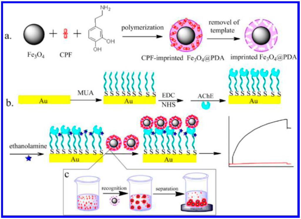 SPR is the collective oscillation of electrons in a solid or liquid stimulated by incident light []. The resonance condition is established when the frequency of light photons matches the natural frequency of surface electrons oscillating against the restoring force of positive nuclei. SPR instruments optically monitor changes that occur on certain metal sensor surfaces (typically gold and silver) when sample fluid flows past the surface. Several SPR optical biosensors have been developed for detecting low levels of AChE inhibitors including pesticides residues [–]. However, because of the small size of the inhibitors, binding of the targets to the AChE-covered sensing chip dose not bring significant shift in the resonance angle. Thus, the use of the simple SPR method for pesticides detection shows a poor sensitivity. NPs can promote a significant shift in the angle of plasmon resonance. Qiu's group reported the synthesis of magnetic molecular imprinting polymers (MIPs) NPs with high density and accessible recognition sites for chlorpyrifos (CPF) []. The magnetic MIPs NPs were synthesized by self-polymerization of dopamine on the surface of Fe3O4 NPs in the presence of template CPF in weak base aqueous solution (Figure 9a). As a result, the target CPF molecules can be rapidly enriched and separated by the imprinted Fe3O4@polydopamine nanoparticles (Fe3O4@PDA NPs) by an external magnetic field. Integrating the CPF-imprinted Fe3O4@PDA NPs to a SPR chip through the specific interactions between the CPF rebound in the recognition cavities in the PDA matrix and the AChE immobilized on sensor chip results in a significant signal amplification due to the high molecular weight of Fe3O4@PDA NPs (Figure 9b). The SPR biosensor showed a low detection limit (0.76 nM) for CPF detection.
