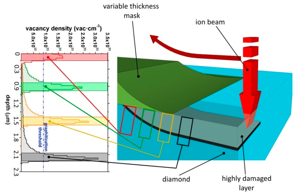 - Bosia, F.; Argiolas, N.; Bazzan, M.; Olivero, P.; Picollo, F.; Sordini, a.; Vannoni, M.; Vittone, E. Modification of the structure of diamond with MeV ion implantation. Diam. Relat. Mater. 2011, 20, 774–778. [Google Scholar]