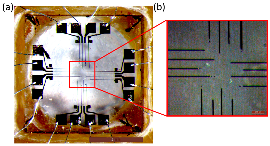 This procedure was repeated 16 times in a suitable geometry, thus allowing the fabrication of 16 micro-channels. As shown in Figure 2, for each channel one emerging endpoint was located in the central area acting as a bio-sensing electrode for cellular in vitro recording, while the other emerging endpoint was located in a peripheral region of the device, thus providing a contact for chip bonding onto the carrier and towards the front-end electronic board. The geometry of the device was defined to have the central sensing electrodes placed as a 4 × 4 matrix with an inter-electrode spacing of 200 μm.