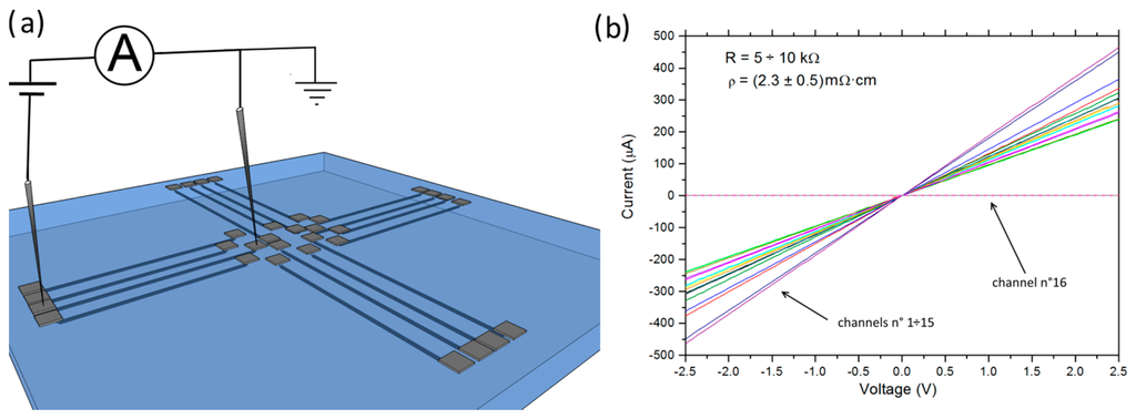 The electrical properties of the 16 micro-channels were investigated by I-V measurements. I-V curves were obtained by probing two contacts located at the endpoints of each single channel, as shown in Figure 3. The I-V characteristics show an ohmic behavior and a resistance of ∼5–10 kΩ was obtained, except for channel #16 that exhibited no electrical conductivity. We attributed the latter feature to an accidental failure during the DIBL fabrication of the channel, which determined its discontinuity and/or an incomplete emergence to the sample surface.
