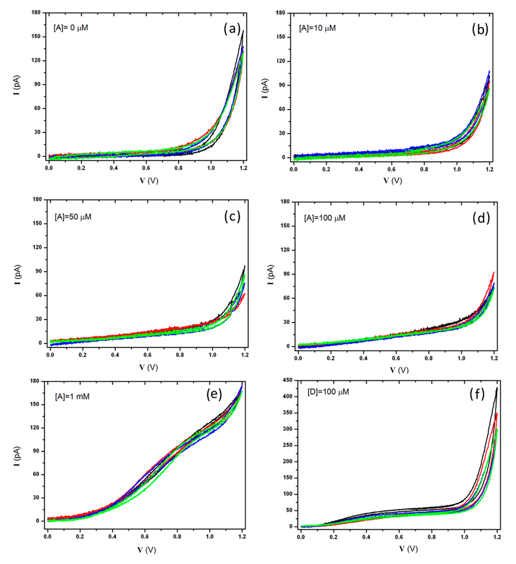 A triangular voltage waveform with a scan rate of 20 mV·s−1 and ranging from 0 V to +1.2 V was applied to the graphitic micro-electrodes with respect to the Ag/AgCl quasi-reference electrode. The voltage-dependent redox currents collected at the micro-electrodes were recorded and processed.
