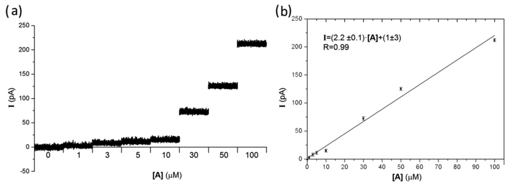 With the purpose of quantifying the sensitivity of the device to adrenaline, the oxidation potential was set to the above-mentioned optimal value (i.e., V = +800 mV) during chronoamperometric tests. Figure 5a shows recordings of one representative electrode (channel #4) in response to 1 ÷ 100 μM adrenaline perfusions. With the exception of the above-mentioned channel #16, the response of all working electrodes was consistent with what reported in Figure 5a. For each concentration, data were acquired for 1 min and then the chip was washed with Tyrode solution and subsequently tested with a different concentration. Averaged data were fitted by linear regression (R = 0.99, slope (2.2 ± 0.1) pA·μM−1), indicating a direct proportionality between the adrenaline concentration in the solution and the amperometric response at V = +800 mV of all micro-electrodes, as shown in Figure 5b. It is worth remarking that such proportionality can be employed in the field of analytical chemistry, ensuring the quantification of unknown concentrations of catecholamines in solution.