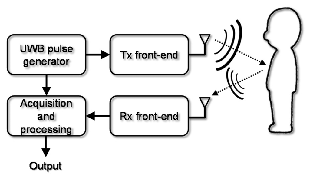 The proposed monitoring system is based on the measurement of the signal reflected back by a subject when radiated with a UWB antenna system. The basic elements of the proposed architecture are shown in Figure 1. The UWB pulse generator sends a train of ultra-short pulses to the transmitter front-end, which is terminated with the transmit antenna. The antenna modifies the shape of the pulses (this must be taken into account in the design) according to its transfer function characteristics. The pulses are reflected by the moving thorax of the subject and come back to the receive antenna where they are acquired and sent to the acquisition and processing system, which gives in output the desired unknown quantities, e.g., the breath frequency.