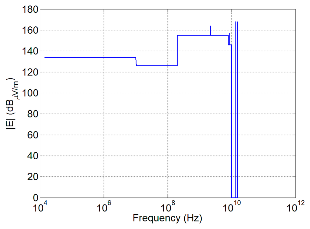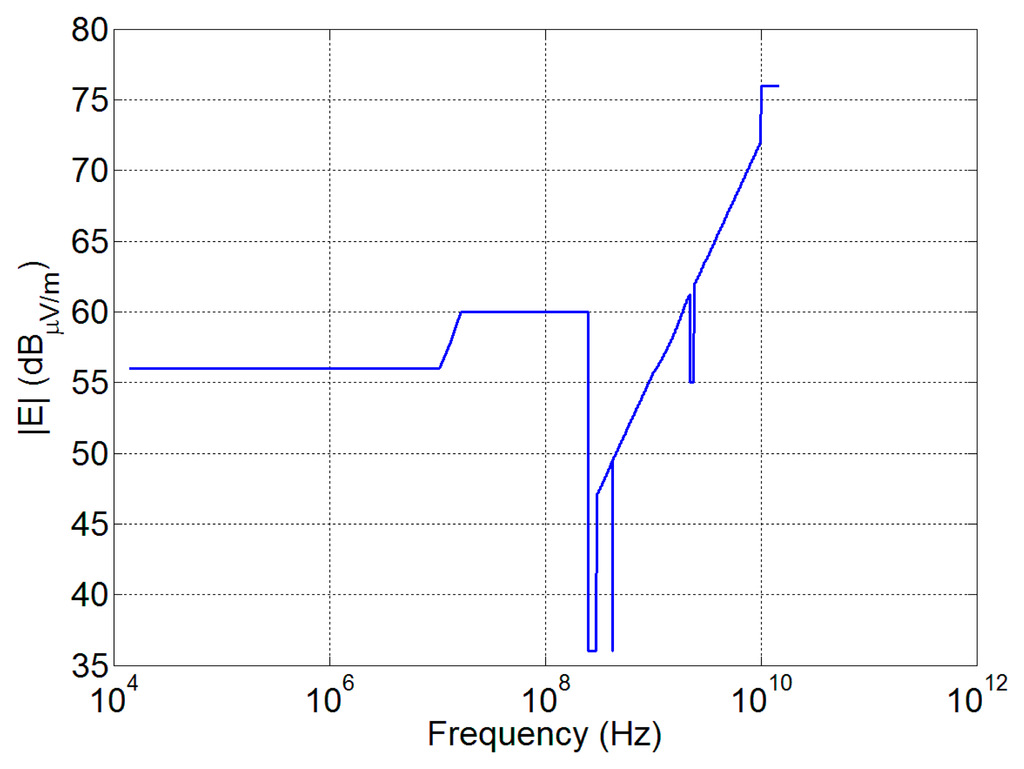 Radiated emission (RE) measurement procedures are defined by the MIL-STD 461 [39] and 462 [40], and the maximum allowed radiated emission levels are reported in Figure 6. As the measurement distance from the antenna is fixed at 1 m, the far field antenna behavior cannot be assumed for the RE prediction and a field computation in near field is required.