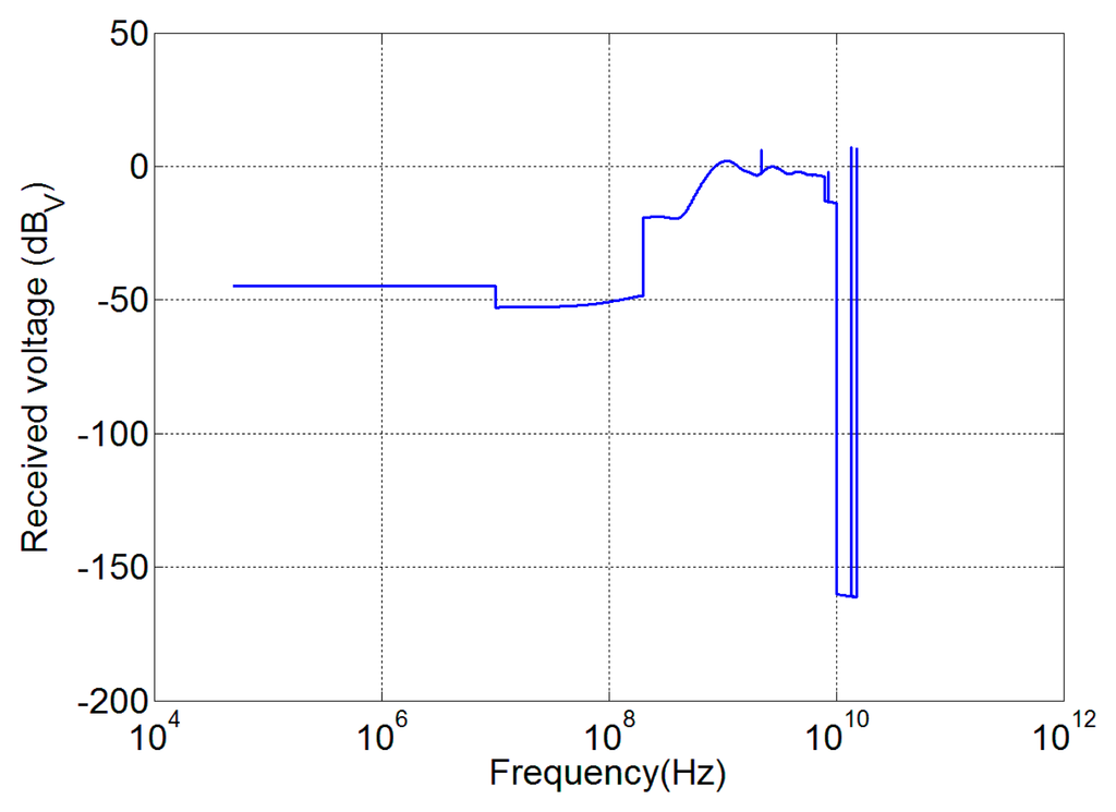 As an example of the procedure, the transfer function of the Vivaldi antenna has been calculated and the received voltage, corresponding to the electric field of Figure 10, has been recovered. The result obtained is shown in Figure 11. This voltage can be used by the designer of the sensing system receiver to verify the front end components hazard and to establish proper countermeasures (limiters or suppressor devices for example).