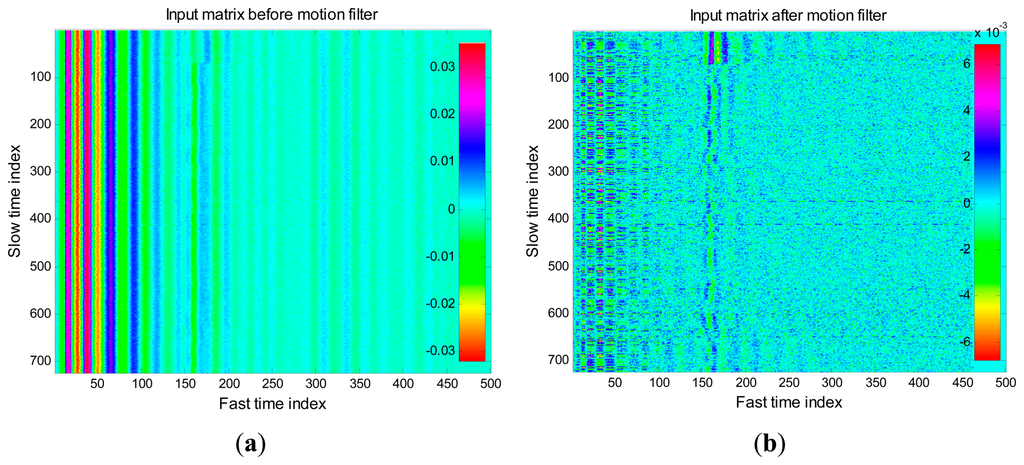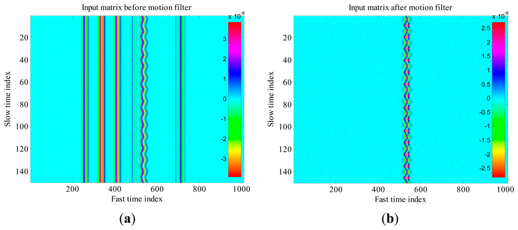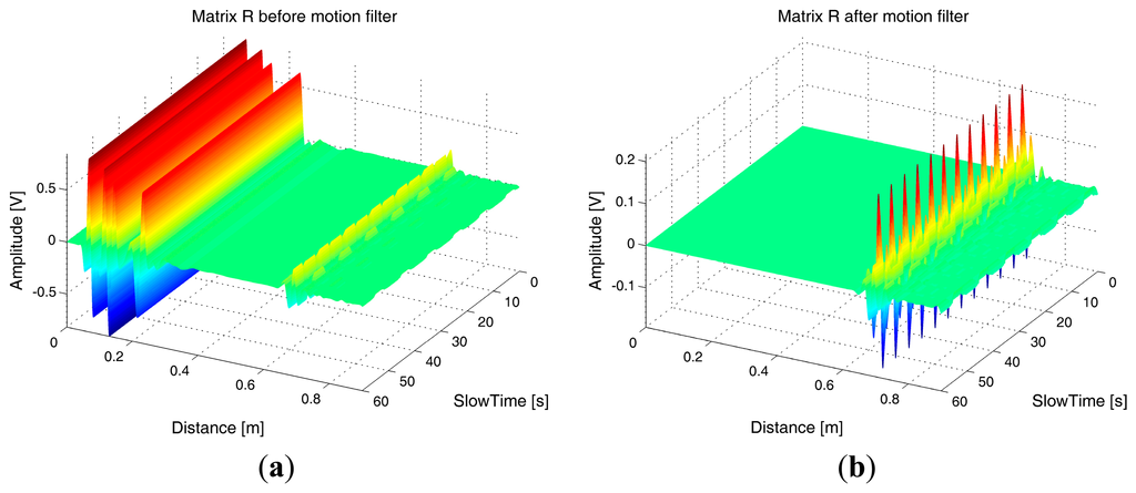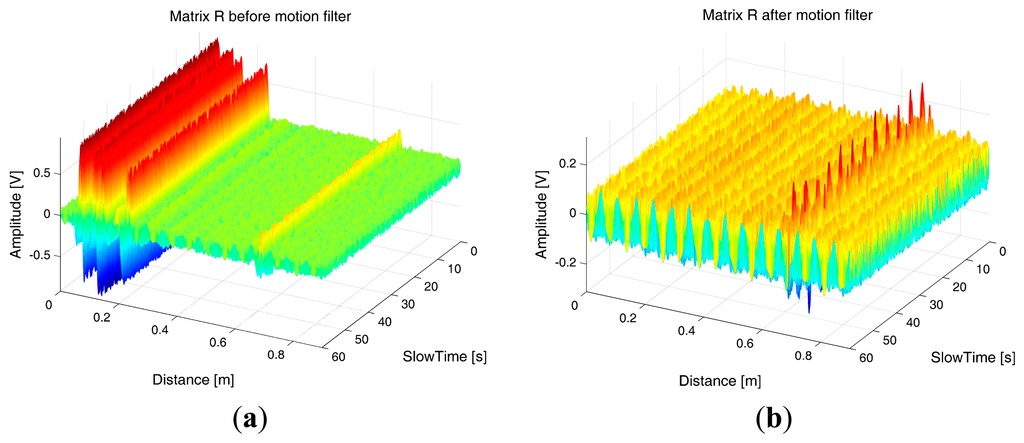 The static clutter is typically removed by using a motion filter [41] that subtracts from each waveform the average of all the waveforms along the slow-time. Figure 12b represents the same matrix R as in Figure 12a, but after application of the motion filter: the static clutter has been completely removed while the oscillating trace, that is due to the thorax reflection and gives the useful signal to detect, is only slightly modified (distorted) by the action of the motion filter.