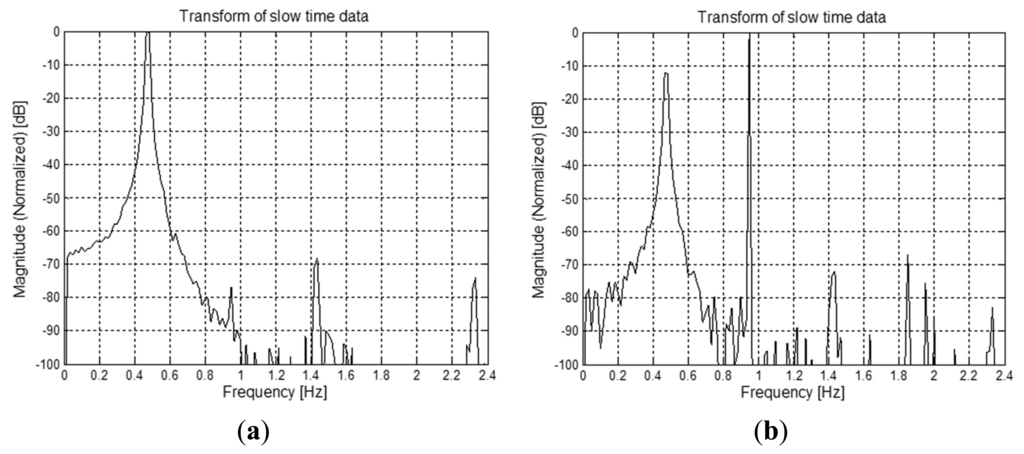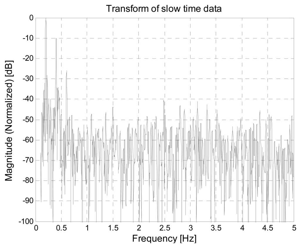 The experiment was performed by placing a human subject at a distance of about 1 m from the transmitting and receiving antennas and acquiring the backscattered waveforms during an observation time of 60 s. The human subject was breathing normally, with a breathing frequency of about 0.18 Hz.