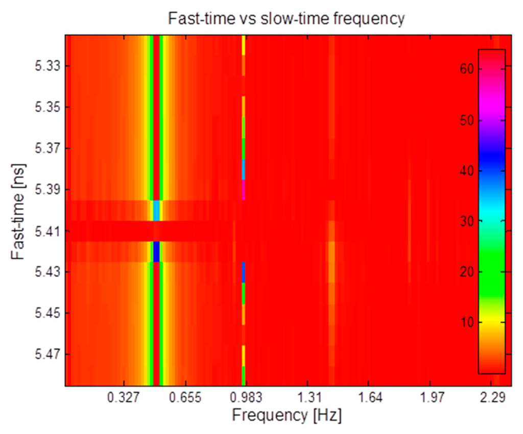 Let us suppose, instead, that the estimate provides a value farther from the exact one, e.g., τ̂0= 5.38 ns. In this case, the FFT provides the result shown in Figure 13b. The highest peak now occurs at a frequency that is twice the right value. In conclusion, we can say that the procedure above, based on a single, properly selected, FFT fast-time instant, produces reliable and unambiguous results only on condition that the estimate of τ0 is very accurate. As mentioned above, the inaccuracy in the estimate of τ0 can be compensated by extending the computation of the Fourier transform to a range centered around τ̂0. Figure 14 shows, in a color map, the values of the Fourier transform computed on the set of columns in a range equivalent to ±5 mm around the estimated nominal distance, when τ̂0 = 5.38 ns. We see that most of the Fourier transforms, in the considered range of fast-time values, show a peak at fb. Obviously, coherent with the previous analysis, some transforms have a peak at 2fb, and this may yield an error if evaluation is done on single vectors. The impact of such wrong estimates is smoothed by averaging the results on the ensemble of transforms. This is shown in Figure 15, that reports the “average” transform so obtained; from the figure, we see that this average spectrum has a peak at fb that, therefore, can be correctly estimated also in the presence of some error in the estimated value of τ0.