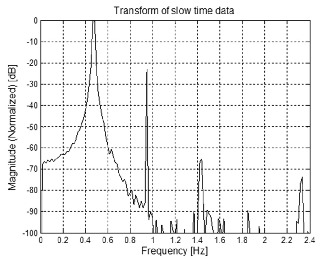 Let us consider a simulated environment, where the thorax movement is modeled through a sinusoidal function (this is a simplifying assumption, that however is acceptable in normal breath conditions. In Section 5, a more general triangle behavior will be also considered) with frequency fb = 0.475 Hz and amplitude mb = 12 mm. The nominal distance between the subject and the antenna is d0 = 0.8 m, that corresponds to τ0 = 5.33 ns. Let us consider Ts = 0.2 s and Tf = 10 ps. This setting corresponds to the matrix R in Figure 12. Let us suppose that the estimate of τ0 provides τ̂0= 5.34 ns. The mono-dimensional slow-time FFT computed, at that instant, along the slow-time axis is shown in Figure 13. The Fourier transform shows peaks at the right breath rate (0.475 Hz) and its multiples, so that the unknown quantity fb can be properly estimated.