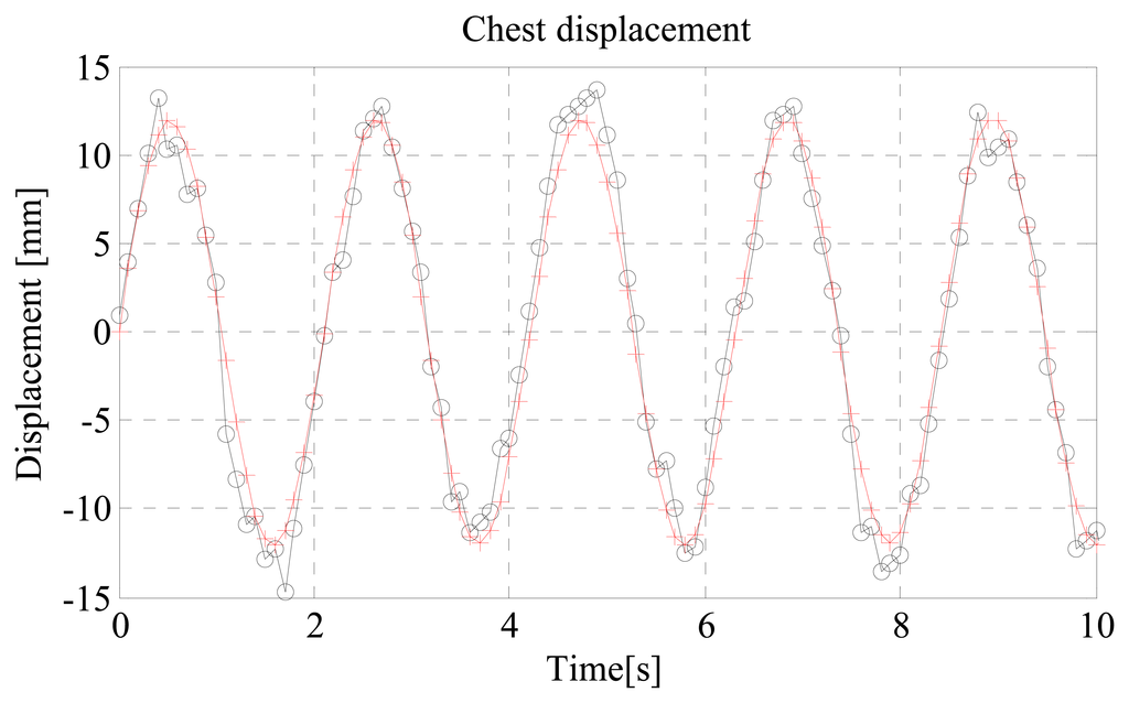 Let us consider the same scenario hinted in Example 1. Following [46], the received signal has been used as the reference signal. The reconstructed thorax movement, originally described through a sinusoidal function with frequency fb = 0.475 Hz and amplitude mb = 12 mm, is plotted in Figure 17. Qualitatively, we see that both the values of fb and mb are estimated with good accuracy.