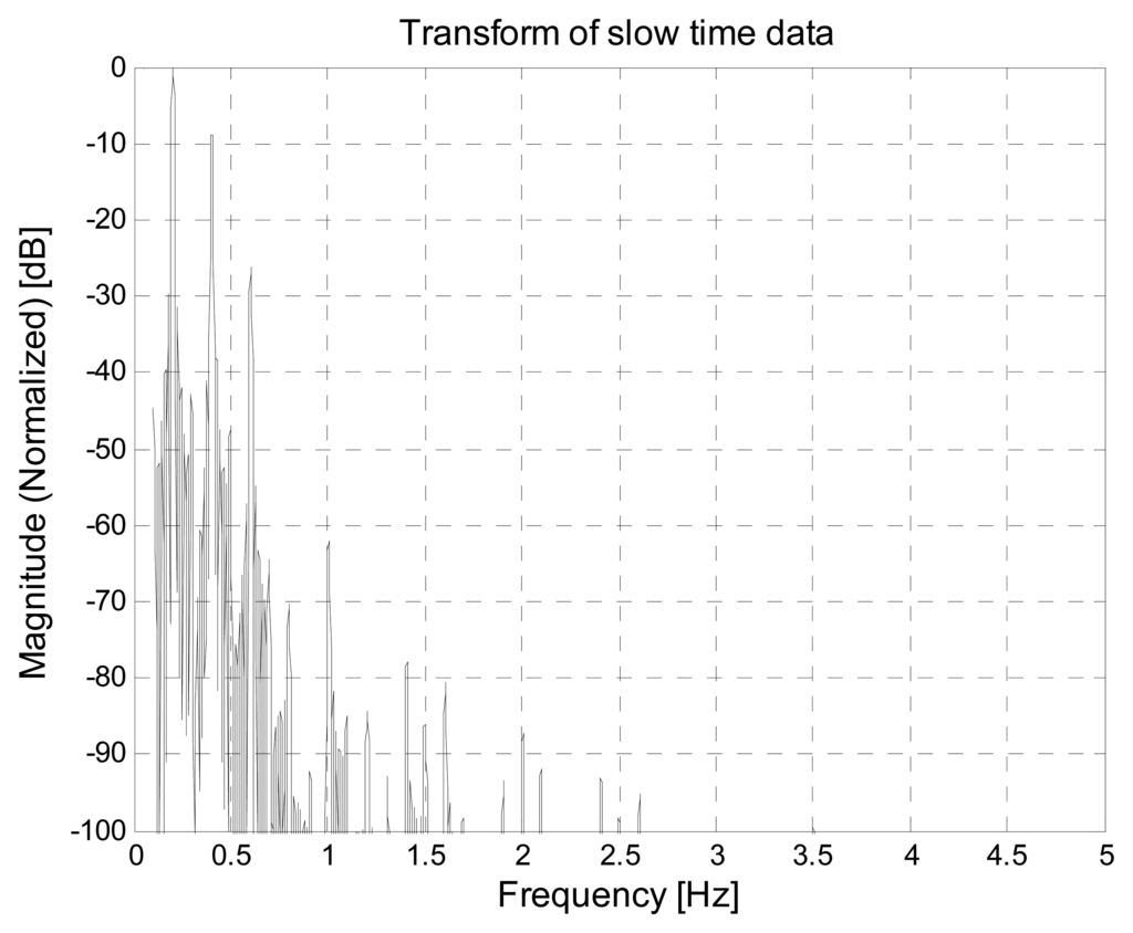 This allows to identify the optimal fast-time instant τ0, corresponding to the subject distance, and to select the relevant data for the spectral analysis. This way, we obtain the frequency spectrum reported in Figure 23, were we observe that the peaks due to the subject respiration frequency and its multiples are clearly visible. By selecting the highest peak, we obtain and estimated breathing frequency f̂b = 0.20288 Hz, which is almost coincident with the real respiration frequency in this experiment.