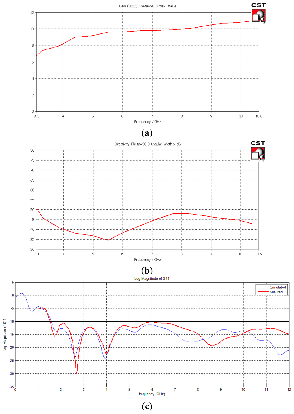 The fundamental features of the antennas, that is, gain, HPBW and S11, respectively, are reported in Figure 3. The electromagnetic environment analyzed in the paper can be considered stressing for the EM simulator and therefore some measurements were carried out to check the proper setting of the parameters and the corresponding accuracy of the numerical results. The first of such tests concerns the measurement of the characteristics of the designed antennas that was performed with a vector network analyzer (VNA). In particular the S11 was measured, because it is one of the most critical parameters of an antenna. The results of the S11 measurements are reported in Figure 3c, and there compared with the simulations. As we can see, the agreement between measurements and simulations results is very good.
