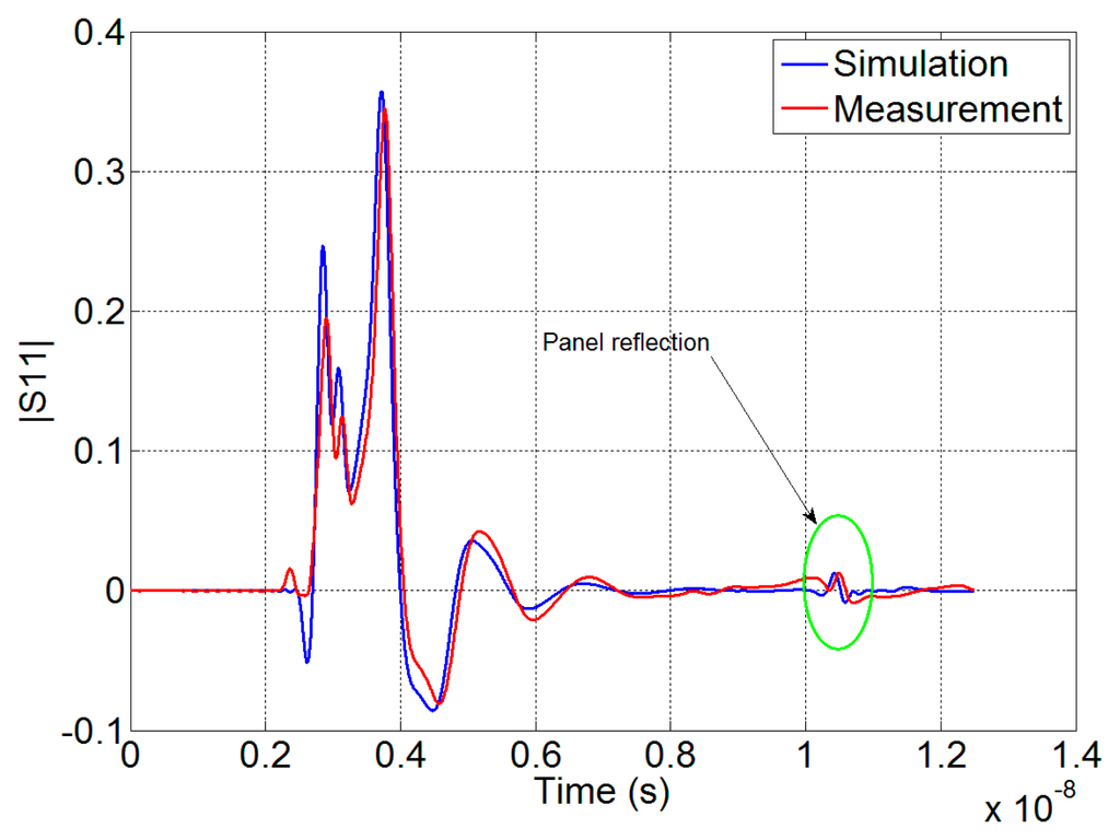 Another configuration taken into account for the software stress test is shown in Figure 4, where the antenna is placed in front of a metallic panel (40 cm × 40 cm) and the S11 of the antenna was measured and simulated. The panel is placed in the near field region of the antenna at a distance of 100 cm. The measurements were carried out inside an anechoic environment. In Figure 5 the signal received by the antenna is reported for both the simulation and the measurements, showing a good agreement. The time domain response of the system to a pulse generated by the VNA is reported: the highest peaks in the range [2–7] ns represent reflections due to the antenna and connectors mismatching, even if we have measured |S11| < −10 dB in the whole UWB range. Also in this case the comparison is very good. This means that even if the antenna mismatch is not high in absolute value, it has to be compared with the useful signal that can be even lower. It is worth noticing that the reflection of the metallic panel is a very low signal that may be masked by environmental disturbances.