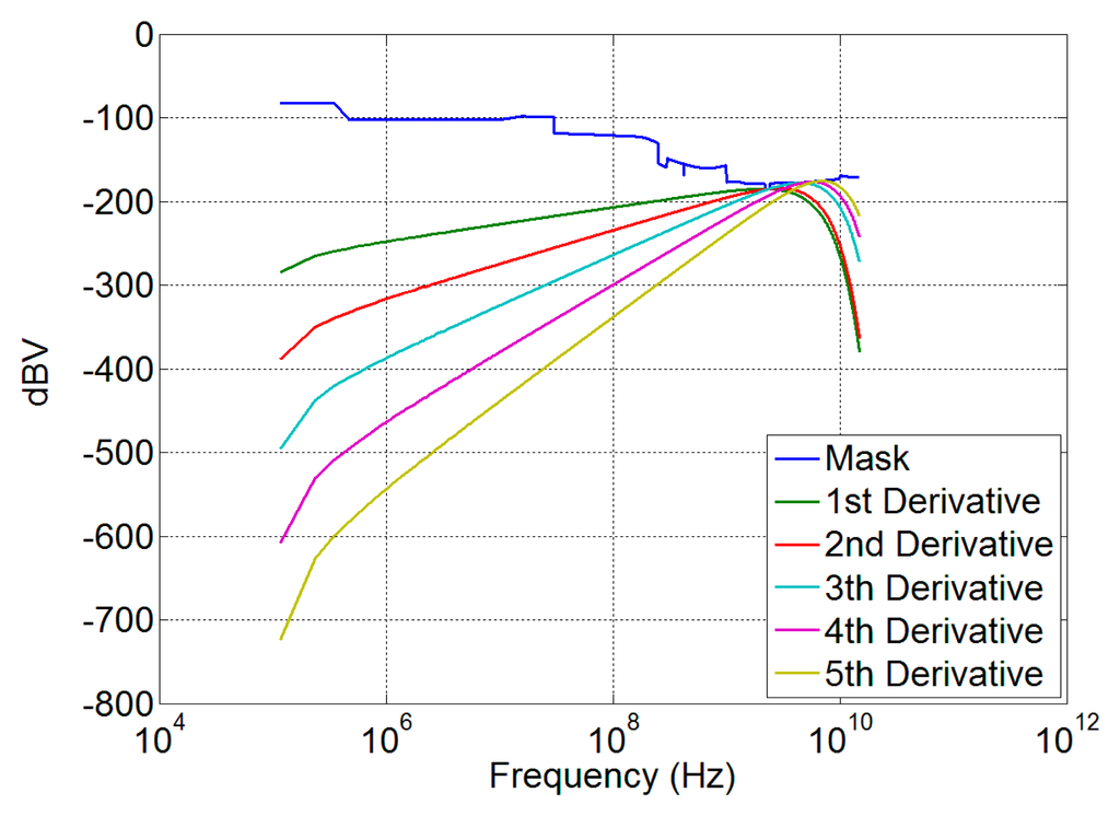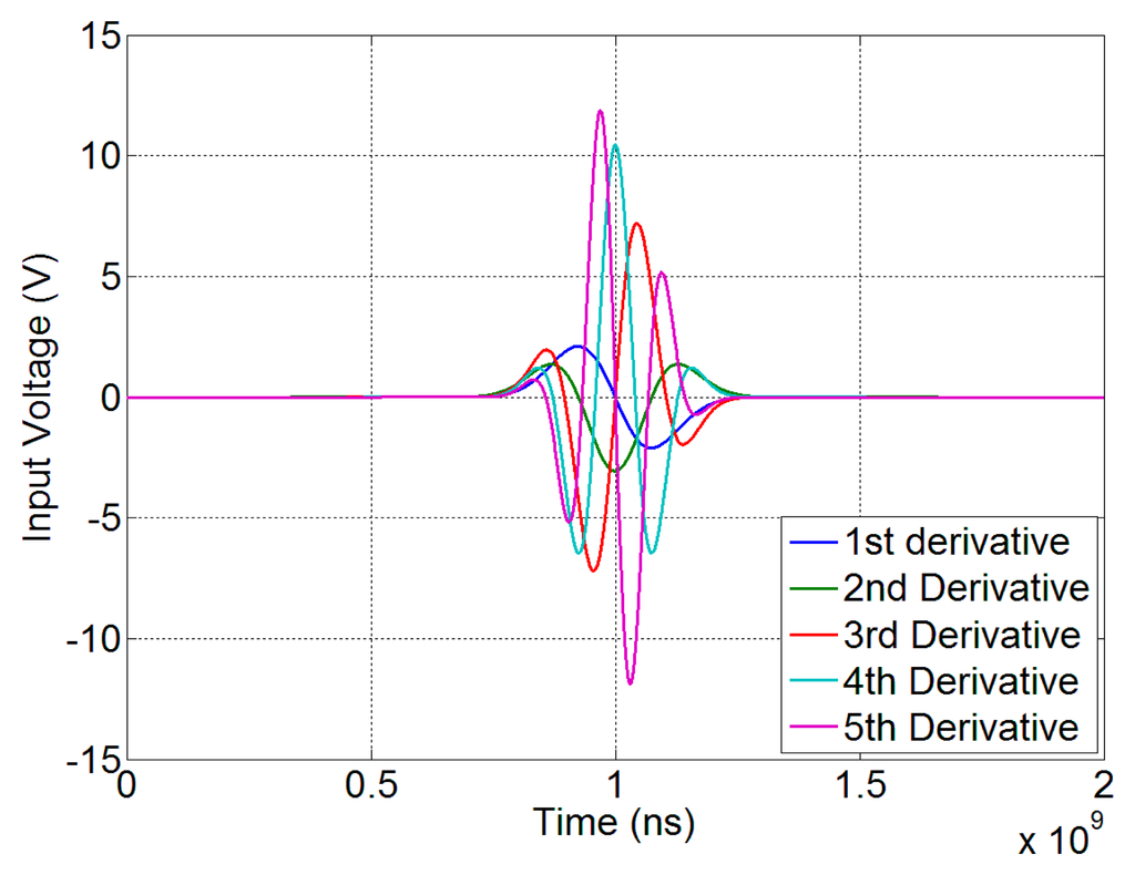 Figure 8 shows the spectral densities of the UWB input signals corresponding to the time impulse reported in Figure 9. It is noticeable that the deep notch at 2.45 GHz produces the highest limitation in the pulse amplitude up to the third derivative, whereas for higher order derivatives its effect is less evident.