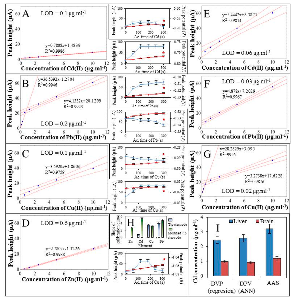 Further, for the use of the slopes of the calibration curves (Figures 2A–2G), sensitivities of the unmodified and modified WE for analysis of individual metal ions were compared (Figure 2H). It was found that modification of WE with mercury film had the greatest effect on detection of Zn(II) and Cd(II) ions. Detection of Zn(II) ions was possible only due to the WE modification. For detection of Cd(II) ions the sensitivity was increased 7-fold. On the other hand an increase in sensitivity was not demonstrated for the detection of Cu(II) and Pb(II) ions within a 5% error bar. Finally, brain and liver samples of the real-chicken embryo treated with Cd(II) ions were analysed. For these samples Cd(II) ions were determined. Comparison of the results measured by both DPASV (without stirring since the samples were placed in a titre plate) and AAS coincided within 10% error, as shown in Figure 2I.