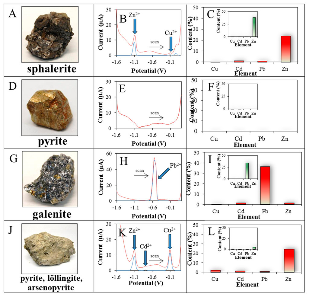 For the fourth sample of analysed rocks, consisting primarily of the minerals arsenopyrite, pyrite and löllingite (Figure 3J) the largest amount of Zn(II) (25%) and in smaller amounts Cu(II) (2.0%), Cd(II) (1.4%) and Pb(II) (1.0%) were determined electrochemically (Figure 3K and L). Similar results were obtained using XRF analysis, but the elements Fe (32%), As (>18.29%), S (8%) and Sn (>2.875%) were also found (not shown).