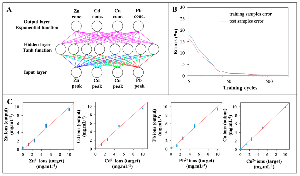Fertilized egg of ISA brown hen (Integra, a.s., Zabcice, Czech Republic) was incubated in a RCom 50 MAX incubator (Gyeongnam, Changwon, Korea) at 37.5 °C and humidity control (45% rH). After 16 days of the incubation the embryo vitality was checked and then a solution of Cd(NO3)2•4H2O (4.5 mg·mL−1 in ACS water) was applied (500 μL) by injection using a Chirana T. injecta device (maximal volume: 1 mL, size: 0.33 × 12 mm) through a small hole in the egg shell into the air cell on the chorioallantoic membrane. After that the hole was covered by a plaster. The chicken embryo was incubated till the next day and then the brain and liver was extracted. From the chicken embryo, 10 mg of tissue (brain, liver) was equally removed, weighed and added to 500 μL of a mixture consisting of 350 μL 65% nitric acid (v/v) and 150 μL 30% hydrogen peroxide (v/v). The solutions were subjected to digestion in a microwave reaction system Anton Paar (Anton Paar GmbH, Graz, Austria) using the following conditions: time 40 min (10 min power 50, 30 min power 100 and 10 min power 0), 60 °C, Rotor-64MG5-16. Mineralized solutions (200 μL) were transferred to a 96-well Deepwell plate 96 evaporation plate (Eppendorf, Hamburg, Germany) and evaporated. For evaporation of samples an Ultravap 96 nitrogen blow-down evaporator with spiral needles (Porvair Sciences, Leatherhead, UK) was used. Finally, the solutions were dissolved in 0.2 M acetate buffer (200 μL, pH 5.0) and were diluted 10-fold with the same acetate buffer prior to analysis. Rock samples (10 mg) were prepared in the same manner as chicken samples. For mineralization the following conditions were used: time 110 min (100 min power-100 and 10 min power-0), 100 °C, Rotor-64MG5-16 and samples were diluted 1000-fold. The plasma samples with random heavy metal concentrations (0–6 μg·mL−1) were prepared as follows: to 10 μL of human plasma specific amount of metals ion stock solutions were added. Mineralized and evaporated samples were diluted to the original volume, then they were diluted 10-fold with acetate buffer (0.2 M, pH 5.0) and used for ANN evaluation.
