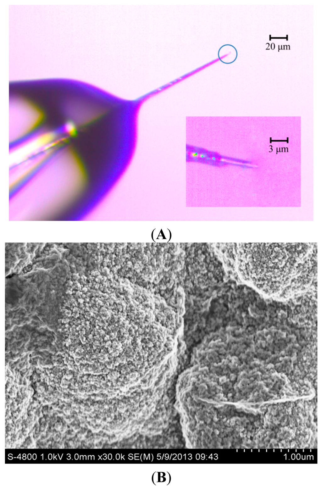 The detection limit of vesicular exocytosis from PC12 cell is influenced deeply by the background noise, which depends on electroactive surface area of the working electrode [2,21]. To reduce the background noise, the conductive portion of microelectrode tip should be as short as possible so that the tip can be positioned close to PC12 cell. Figure 1A shows the CFE, whose conductive length was 5 μm and the diameter was 2 μm. The inset in Figure 1A shows the interface between carbon fiber and the glass insulator. The rest of the exposed CFE was well sealed with molten glass micropipette while the tip of the electrode was cone shaped by blue flame etching from an alcohol burner.