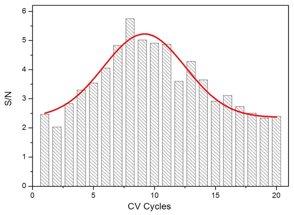 In order to properly improve dopamine sensitivity and detection limit with CFE, PPyox nano-film have been attempted to modify the microelectrode. Twenty CFEs were electrodeposited with PPyox using cyclic voltammetry in a period from 1 to 20 cycles, respectively. We identified the optimal electrodeposition condition through signal-to-noise (S/N) statistics of their current response to 2 μM DA solution, as shown in Figure 2. S/N, an important parameter of measuring the anti-noise ability, is the ratio of response current and baseline. The increment of S/N grew with more electrode position cycles up to 8. At cycles of 9 or more, the S/N decreased. Furthermore, the population of S/N is an approximate Gaussian distribution. These results may be attributed to the increase in membrane thickness of PPyox as the number of electro-deposition cycle rises, so that more produced nanoparticles and holes could bring in more noise while the sensitivity improves. Thus, we determined that 8 cycles of electrode position is optimal to achieve the best sensitivity and detection limit of DA.