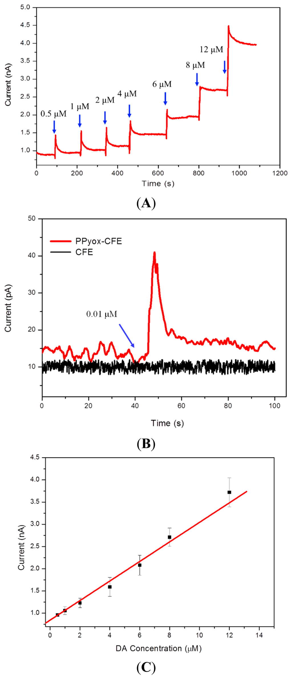 In order to determine the sensitivity using the CFE electrodeposited with PPyox film, Stepwise addition of aliquots of DA to a stirred solution resulted in stepwise increase of anodic current as described in Figure 4A. Chronoamperometry was employed to detect DA at the potential of 149 mV obtained by the cyclic voltammetry measurement. As shown in Figure 4C, the oxidation current of the DA increases linearly with concentrations in the range of 0.5 μM to 12 μM, with a correlation coefficient of 0.994. Since the surface area of the microelectrode is 22.65 μm2, the detection sensitivity of the PPyox-CFE is 24.55 μA·μM−1·μm−2. To study the detection limit of DA with the CFE, we compare I-T curves of the CFE with that of PPyox-CFE. Figure 4B shows the DA detection limit of 0.01 μM (S/N = 3.3) using PPyox-CFE, however, there is no obvious change in the process of adding DA solution as using CFE. The results demonstrated a low detection limit of the prepared PPyox-CFE, indicating the advantage of the polymerization process generated a rather rough surface, which dramatically elevated the amperometric response of PPyox-CFE by enlarging the effective area.