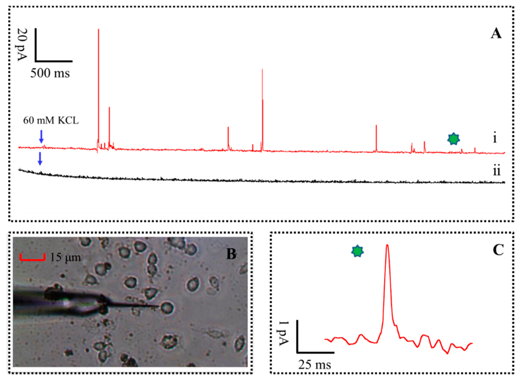 - Borges, R.; Camacho, M.; Gillis, K.D. Measuring secretion in chromaffin cells using electrophysio-logical and electrochemical methods. Acta Physiol. 2008, 192, 173–184. [Google Scholar]