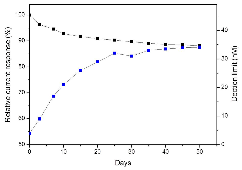 The stability of the PPyox-CFE was studied by keeping the CFE in PBS at 4 °C for four weeks after having been used for detecting DA release from single PC12 cell. Over the first seven days, the sensitivity of DA decreased by 5.4% and the detection limit was 17 nM. The sensitivity of DA maintained 88.1% of the original sensitivity value after 50 days as shown in Figure 6. These results indicate that the CFE electrodeposited with PPyox film displayed stable and excellent response to DA.