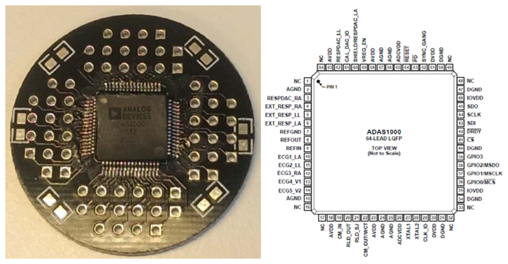 The ADAS can provide a sample rate of up to 128 kHz and is suitable for portable battery-operated devices, bedside patient monitoring, portable telemetry, and home monitoring systems. ADAS chips can be used in gang mode to provide more ECG channels [15]. In this work, one/two ADAS1000BSTZ is used—that is, the five-channel version that includes all features—as a master and optional slave to provide 8-12 leads ECG in version A and B, respectively. Alternatively, a more affordable version ADAS1000-2BSTZ can be used as slave chip. The chip is used with LQFP 64 pin package, see Figure 2. It is worth to mention that manual soldering of LQFP64 package is relatively difficult and needs some experience and high level of soldering skills.