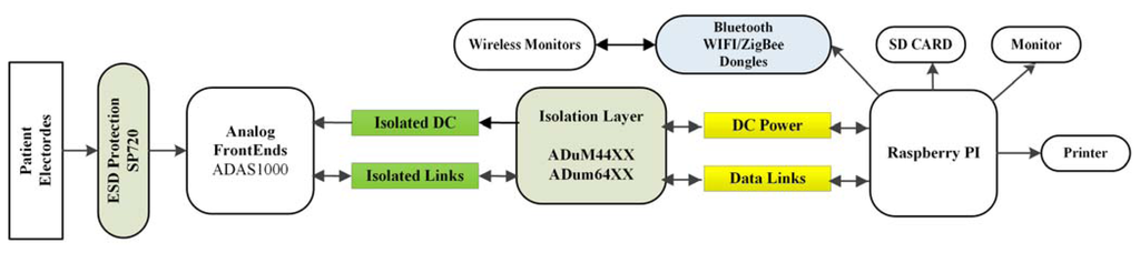 Figure 3 shows the proposed system architecture for Biosignal PI. The system includes RPI as a computational module, a digital and DC power isolation layer, electrostatic discharge (ESD) protection for body electrodes connected to analogue biosignal front-ends. Different biosignals and vital sign monitoring modules can be added by proper front-ends or as wireless monitors through Bluetooth, WiFi, or ZigBee. RPI may be connected to different peripherals such as monitor, printer and keyboard and even available shields for RPI depend on each demands of each project. RPI and potential peripherals are not designed as medical device and hence insulation layer is used to isolate the breakout board from RPI. Even if insulation and ESD protection characteristics are chosen to comply with requirements for patient safety, no steps towards formal certification have been taken. It is up to anyone who wants to base an MDD or FDA approved device on the Biosignal PI to make sure that all requirements are met.
