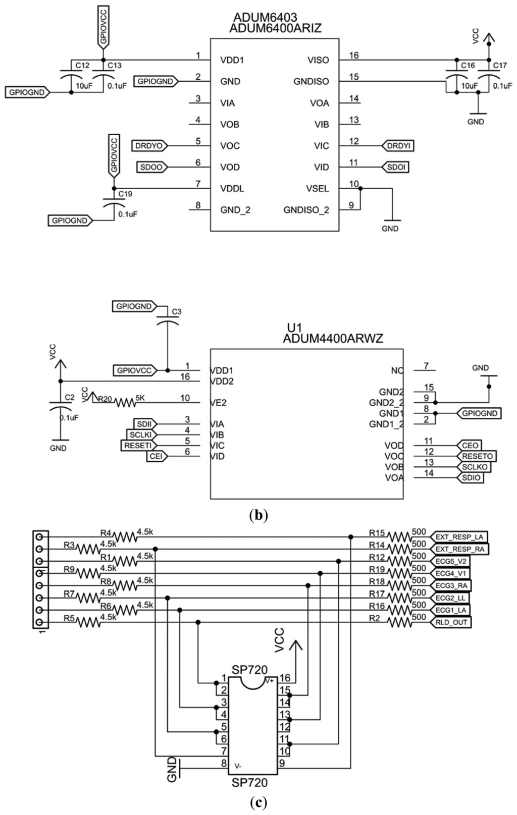 Optocouplers are typical components use to achieve insulation, signals are transferred between isolated parts and none isolated part using light. An alternative is iCoupler technology, combining high-speed CMOS and monolithic air core transformer technology, which allows lower cost, size, power, and higher reliability compared to optocouplers [21]. The SPI and DC lines are isolated by using the ADuM64XX and ADuM44XX family from Analog Devices. They provide 5 kV isolation, thus comply with IEC 60601 and IEC 60950. The ADuM6200 provides isolated DC power, and ADuM4400 gives isolated digital communication, allowing a bit rate of 90 Mbps [22–24].