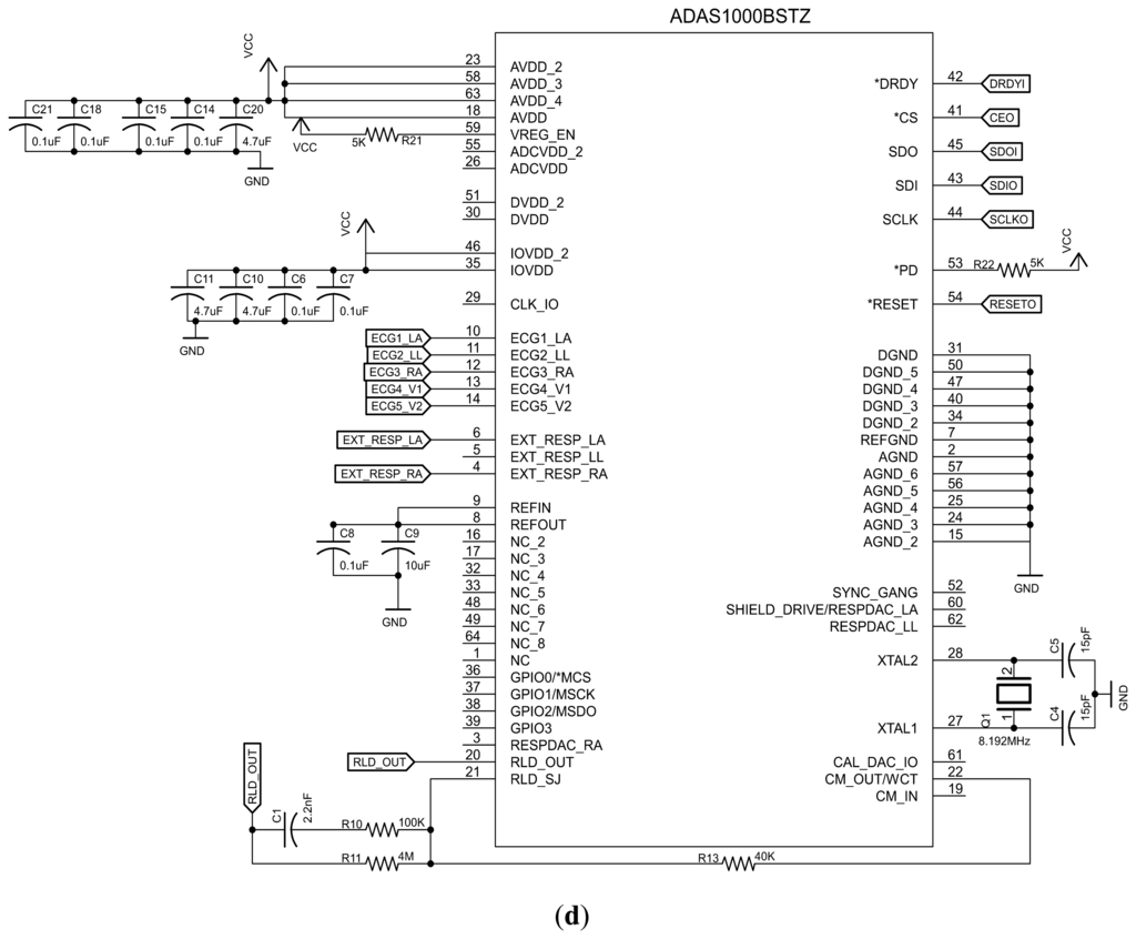 In the first implementation of this architecture, ECG and respiration breakout board was designed for the ADAS1000 chip. The schematic and double-layer printed circuit board (PCB) was designed using the free version of CadSoft Eagle V6.5 [27]. Figure 4 shows the schematic diagram of a 5–8 leads system with all necessary components for operation of ADAS, ESD protection and isolation of board from RPI.