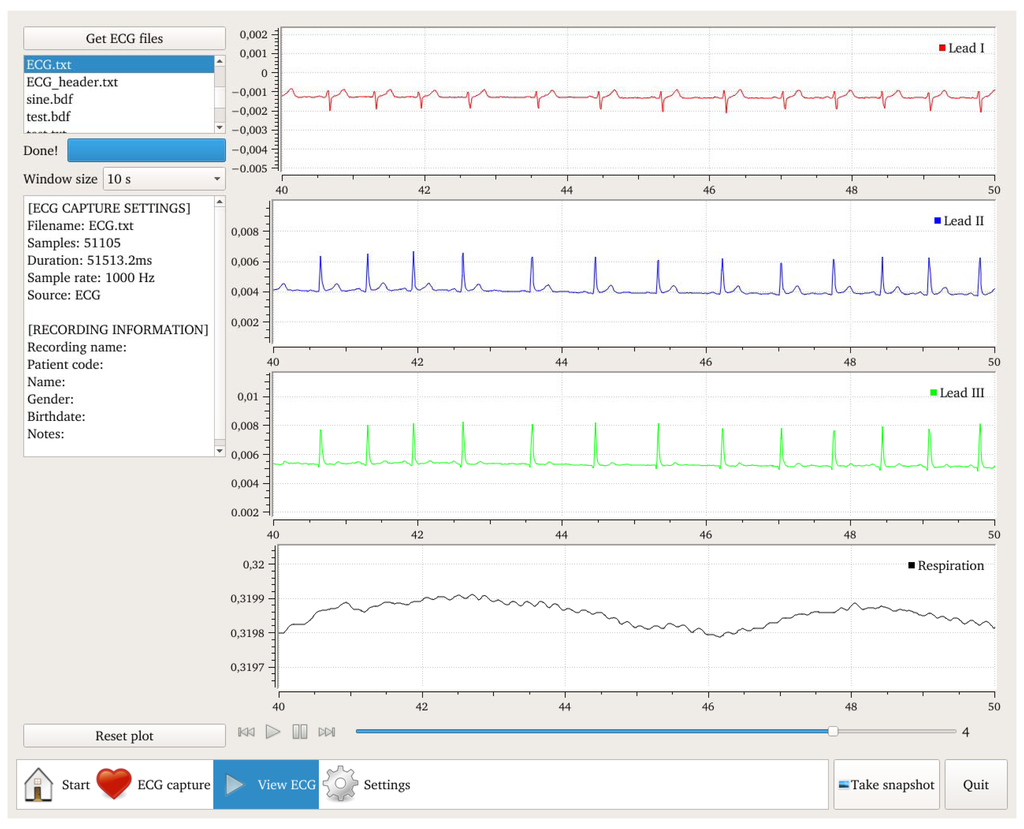 The implemented software can capture ECG and respiration signals at selectable sampling frequencies and visualize them in the real-time. The captured signals can be saved as text file or in European Data Format (EDF) [28]. The software currently provides an interface for browsing the recorded files. A screenshot of the Graphical User Interface (GUI) for browsing the recorded file is depicted in Figure 6. The screenshot illustrates a 10 s epoch of a 3-leads ECG and respiration for a healthy subject. The respiration activity is recorded by using thoracic impedance at 56 kHz through Lead I (right and left arms).