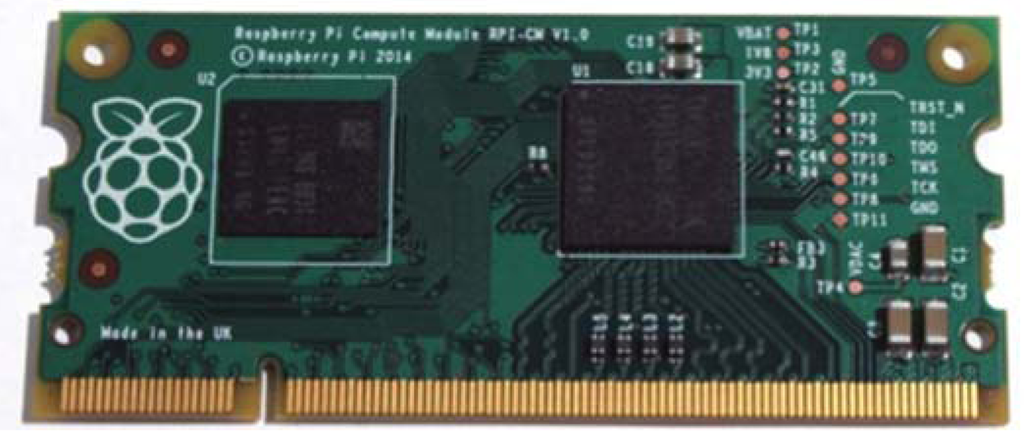 A recently introduced version, called Compute Module is aim to overcome this limitations. This module includes an RPi (the BCM2835 processor and 512 MB of RAM), 4 GB eMMC Flash and is integrated on to a small 67.6 × 30 mm board which fits into a standard DDR2 SODIMM connector. RPI Compute Module is depicted in Figure 7.