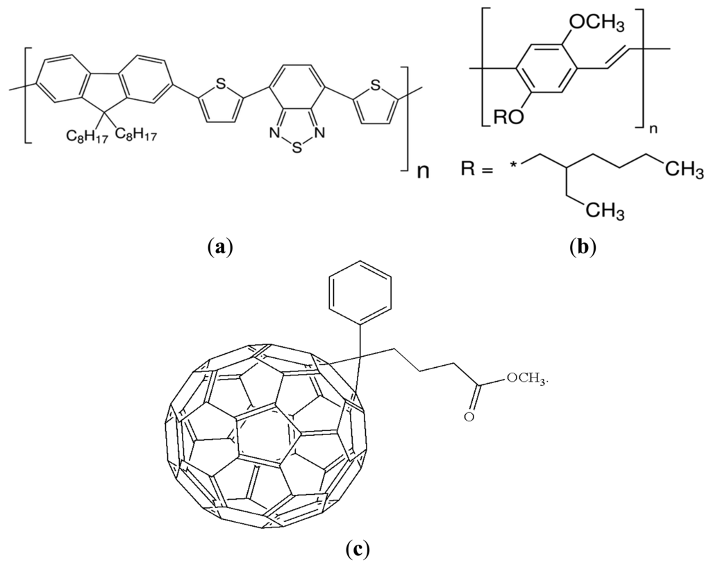 - Zhou, Q.; Hou, Q.; Zheng, L.; Deng, X.; Yu, G.; Cao, Y. Fluorene-based low band-gap copolymers for high performance photovoltaic devices. Appl. Phys. Lett. 2004, 84, 1653–1655. [Google Scholar]