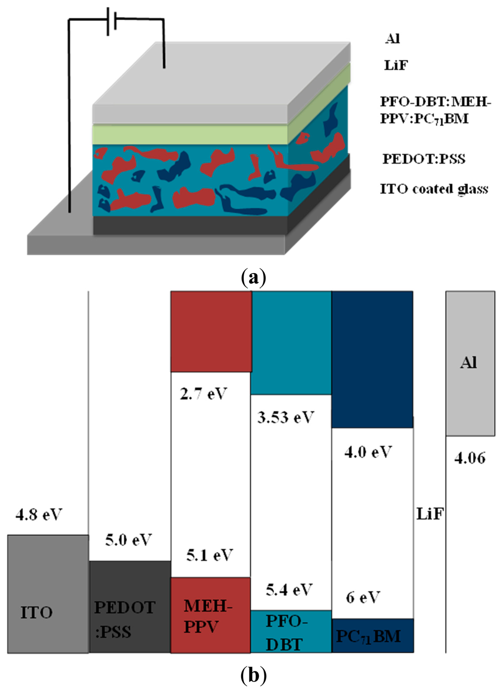 The layer stack of the fabricated OPD (ITO/PEDOT:PSS/PFO-DBT:MEH-PPV:PC71BM/LiF/Al) and energy level diagram of the components have been depicted in Figure 2a,b, respectively. Figure 2b shows the energy levels of PFO-DBT, MEH-PPV and PC71BM and work functions of ITO and Al. The HOMO/LUMO energy levels were obtained from material safety data sheets (MSDS) provided by the manufacturer of the materials. Same values have also been reported by other researchers in the literature [23,26,27]. Inorganic fluorides such as LiF have good electron extraction ability from active layer, further they serve as a hole blocking layer as well [28]. PEDOT:PSS on the contrary, serves as a buffer layer for hole collection at the ITO anode. The energetic position of the frontier levels of the D/A materials used in the present work ensures better flow of photogenerated charges to the appropriate direction. The potential offset at the D/A interfaces provide adequate energy to dissociate electron-hole pairs. The transport and collection of mobile charge carriers at the electrodes is then facilitated by the external bias and built-in electric field between PEDOT:PSS and Al work functions.