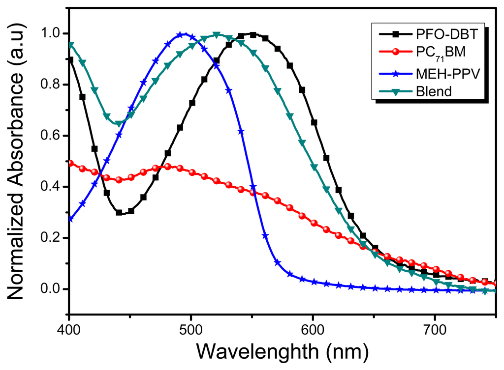 Figure 3, compares the optical absorption spectra of the photoactive donor polymers: MEH-PPV, PFO-DBT and acceptor moiety PC71BM. The peak optical absorption of MEH-PPV is at 510 nm, which indicates that substantial portion of incident visible light is not harvested by MEH-PPV alone. The motivation here is to extend the absorption profile of the photoactive film of OPD still further toward longer wavelengths. The approach used to achieve a comprehensive coverage of the solar spectrum is the addition of other polymeric donor material with a complimentary absorption profile. For instance, PFO-DBT exhibits a light complementary absorption to that of MEH-PPV. The UV-VIS spectroscopic data confirms that PFO-DBT dominates the spectral absorbance above 590 nm, where either of MEH-PPV and PC71BM fails to absorb photons. The absorption spectrum of PFO-DBT exhibits two maxima; the first is located at 384 and the second at 540 nm. Yong et al. [29] suggest that absorption band at smaller wavelengths is attributed to fluorine segment and the additional longer wavelength absorption band is attributed to DBT unit of the PFO-DBT polymer. By virtue of complimentary absorption profile, the inlay of PFO-DBT to the MEH-PPV-PC71BM is believed to yield a broader and consistent absorption spectrum. Further, PC71BM exhibits strong absorption ability at shorter wavelengths (350–500 nm) [30], hence it is potentially adopted as an acceptor material in BHJ solar cells with relatively higher power conversion efficiency (PCE) [31–33]. The spectral response of the MEH-PPV:PCBM and PFO-DBT:PCBM based photovoltaic devices have already been reported [23]. Further, it can be cross-referenced that the spectral response is in good agreement with the independent material's absorption spectra.