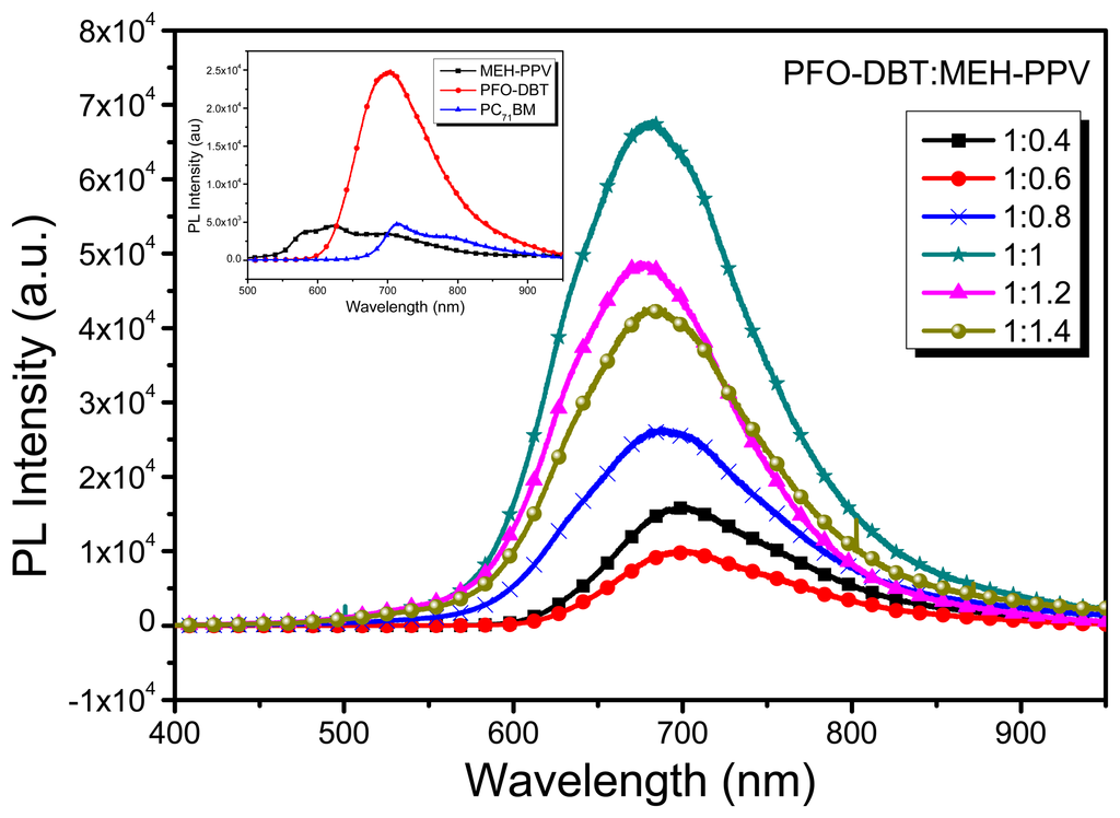 Poly[2,7-(9,9-di-octyl-fluorene)-alt-4,7-bis(thiophen-2-yl)benzo-2,1,3-thiadiazole] (PFO-DBT) and [6,6]-phenyl-C71-butyric-acid methyl ester (PC71BM) were obtained from a commercial supplier Luminescence Technology Corp. (Taiwan, China). No further purification was done and they were used as received. Poly[2-methoxy-5-(2′-ethylhexyloxy)-p-phenylenevinylene] (MEH-PPV) was synthesized by established Gilch's polymerization reaction [24]. The aqueous solution of poly(3,4-ethylenedioxythiophene):poly(styrene sulfonate) (PEDOT:PSS) with PH ∼1000 and conductivity 900–1000 S/cm was commercially obtained from H.C. Starck (Goslar, Germany). Molecular structures of PFO-DBT, MEH-PPV and PC71BM are depicted in Figure 1. Commercially available ITO substrates (25 mm × 25 mm slides, sheet resistance ∼12 Ω/sq), were cleaned according to a well-established protocol i.e., by ultrasonic agitation in acetone, ethanol, isopropyl alcohol and DI water, respectively, and later substrates were dried clean by blown nitrogen. An anode buffer layer of PEDOT:PSS was then spun-coated onto ITO substrates at 3000 rpm for 30 s. The resulting transparent (∼40 nm thick) PEDOT:PSS thin film was annealed at 120 °C for half an hour. Thirty mg/mL concentrated solutions for PFO-DBT, MEH-PPV and PC71BM each, were prepared separately in chloroform by stirring them overnight at room temperature. The photoactive layer of PFO-DBT:MEH-PPV:PC71BM ternary blend with optimum ratio was spun cast on top of PEDOT:PSS layer. Spin speed was maintained at 4000 rpm, yielding a thickness of 120 nm. Photoactive layer deposition was followed by baking at 120 °C for half an hour. The optimum mixing ratio (by volume) of donor binary blend was selected by the help of photoluminescence (PL) study. A thin film of LiF (∼10 Å) was used between active layer and top electrode to enhance the performance of the OPD. Two of the several suggested advantages of LiF coating are: (a) lowering of the effective work function of top Al cathode and (b) protection of photoactive layer from hot Al atoms during its deposition [25]. Both LiF and aluminium (Al) were thermally deposited via shadow mask. The fabricated devices were in circular shapes with diameter ∼1 mm. The evaporation rates for LiF and Al cathodes were controlled to be 0.1 and 3 nm/s to achieve a thickness of 0.8 and 100 nm, respectively. Finally the fabricated devices were annealed at 120 °C for 30 min. The entire fabrication process of OPD was carried out into a glove-box with inert N2 atmosphere, except for the PEDOT:PSS aqueous solution coating. The optical absorption study in visible spectral range was carried out using a UV-Vis-NIR spectrophotometer (Shimadzu UV-3101PC). The photoluminescence (PL) dynamics of active film in the visible and near-infrared-spectral ranges were studied by using RENISHAW in via a Raman microscope instrument. The RENISHAW in via Raman microscope instrument uses the 325 nm laser wavelength and the detector limits of this system are 400–1000 nm. The I-V characteristics of the OPD were measured under different light intensities (0–150 mW/cm2) using an Oriel 67,005 solar simulator and were recorded by a Keithley 236 source measuring unit (SMU).