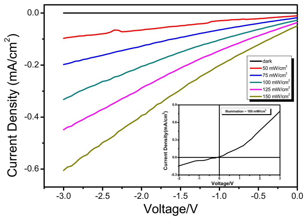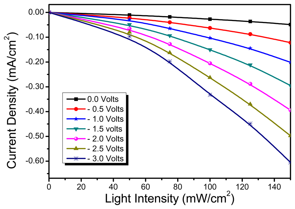 Typically, the photodetector functions as a photodiode in photoconductive mode and is usually operated in reverse biased configuration. The use of two electrodes (ITO and Al) with different work function, ensures the diodic behaviour as is evident from characteristic IV curves of diode Figure 5 (inset). With the increase in optical power density, the generation rate of mobile charge carriers increases and resultantly photodetector outputs an increased photocurrent. This aforementioned phenomenon forms the basis of operation principle of photo detector. To evaluate the performance of the ternary blend based OPD, its reversed biased current-voltage (I-V) characteristics were investigated. Figure 5, shows the photoresponse of the OPD when exposed to simulated light of varied illumination levels. It can be observed that the reverse biased current in dark condition (Idark) is quite low as compared to the photo induced current (Ilight) under the influence of simulated light illumination. It is also evident from Figure 5 that with higher influx of incident photons on OPD; a higher density of separated charges approaches the electrodes, giving rise to pronounced magnitude of photocurrent. Furthermore, from Figure 6, it can be inferred that magnitude of photoresponse is increased with the increase in the electric field (sourced by external reverse bias voltage). In fact, the couple of bottlenecks to better photoresponse are: (1) enhanced photon absorption; (2) efficient creation and splitting of excitons into independent holes and electrons; (3) efficient transportation of charges to collection electrodes. The bulk heterojunction blend approach helps only to improve both photon absorption and exciton dissociation. However the migration of separated charges towards electrodes is external field assisted. External biasing serves as a driving force for transportation of charge carriers through interpenetrating D/A networks. The transportation becomes faster and efficient at higher order of potential bias, resulting in improved photoresponse. However at lower biasing, mobile charges are more likely to get trapped or encounter recombination rather than being collected at the electrodes.
